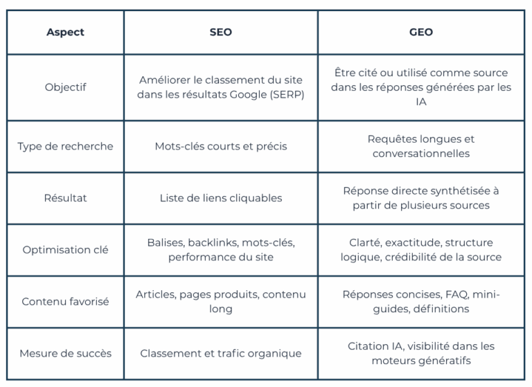 Mais en 2025, une nouvelle ère s’installe : celle du GEO (Generative Engine Optimization). Les moteurs de recherche traditionnels (tels que Google, Yahoo!, Bing) affichent une liste de liens. Les moteurs génératifs (comme ChatGPT, Gemini, Perplexity) créent directement une réponse, en s’appuyant sur des sources qu’ils jugent fiables.